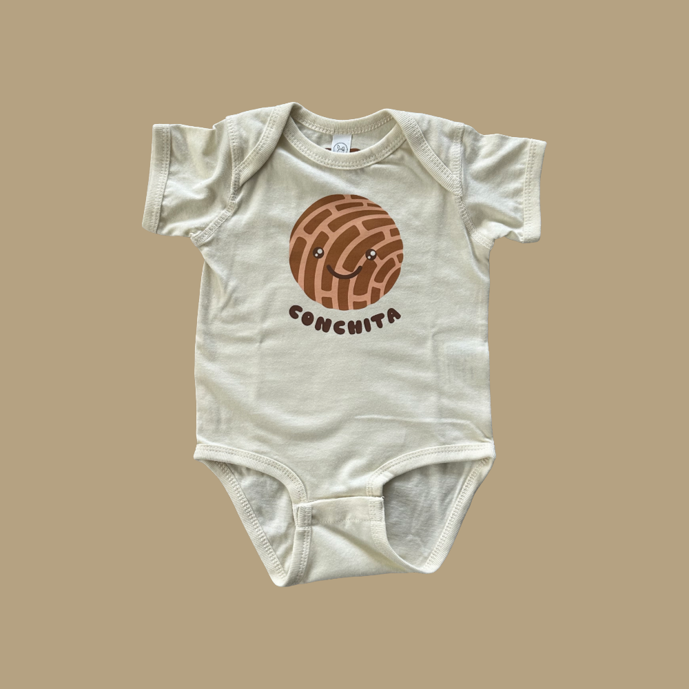 Conchita de chocolate in Natural colored 100% cotton shirts and baby bodysuits.