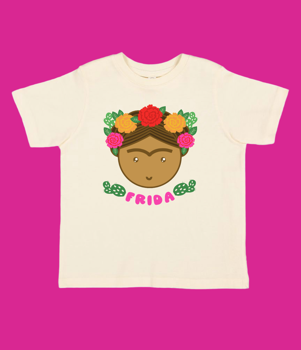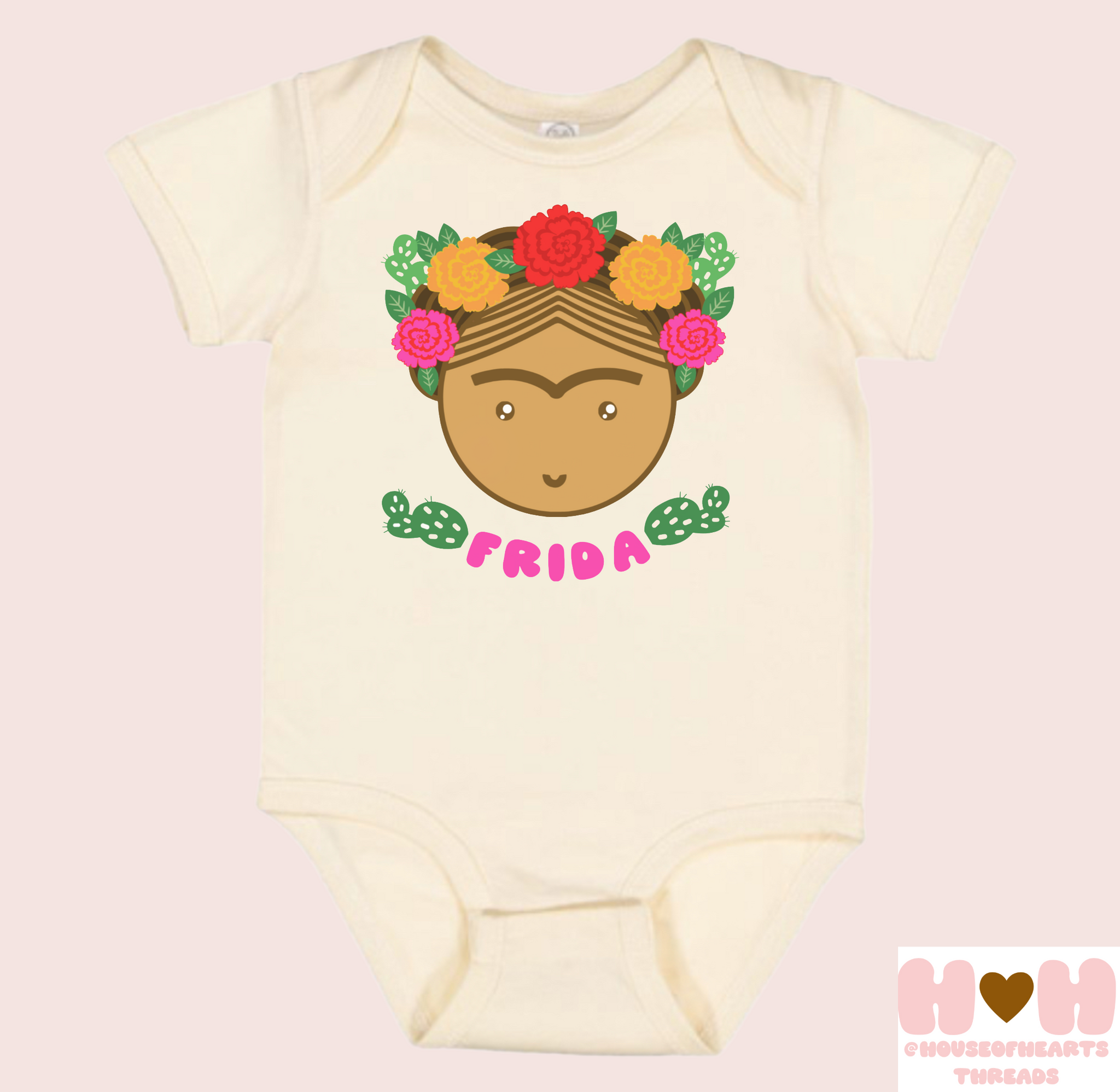 Colorful floral Frida on Natural colored 100% cotton shirts and baby bodysuits.